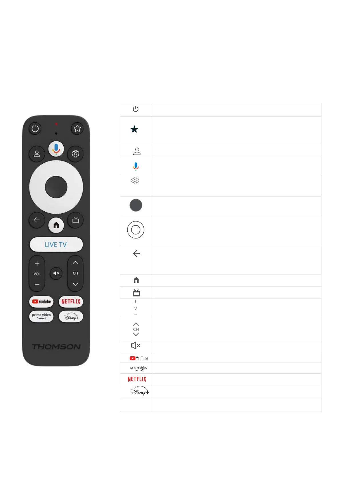 Volume +/-: Controls the sound volume of the TV