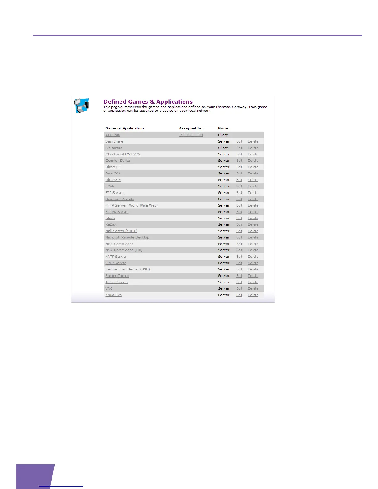 Remove a game or application from your Thomson Gateway, click the Delete link of the game or