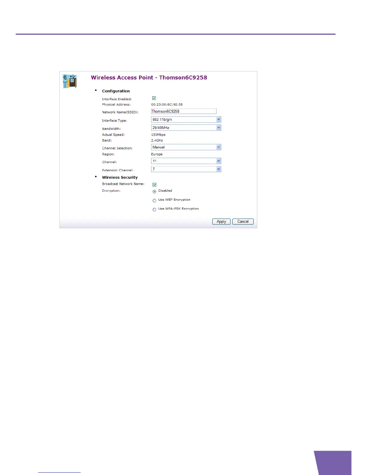 The physical address or MAC address of the wireless access point (your Thomson Gateway) is static and