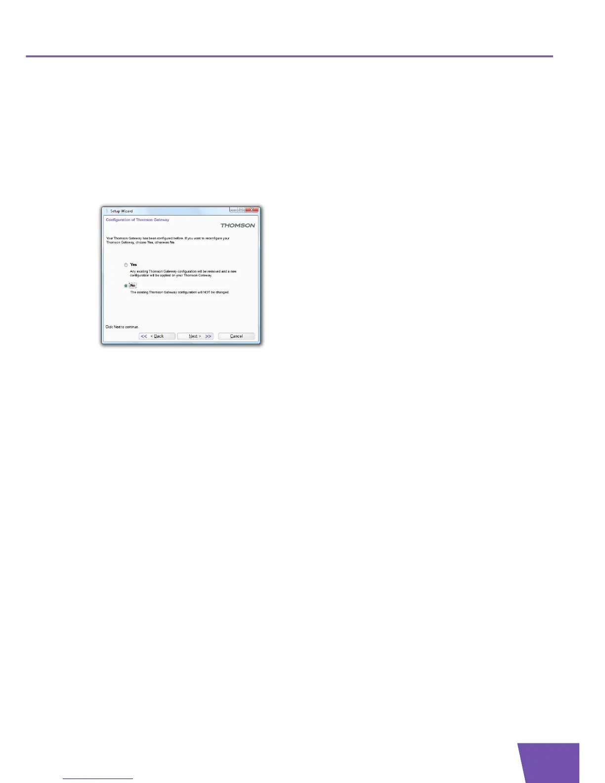 When the Setup wizard informs you that the Thomson Gateway has already been configured, select No and