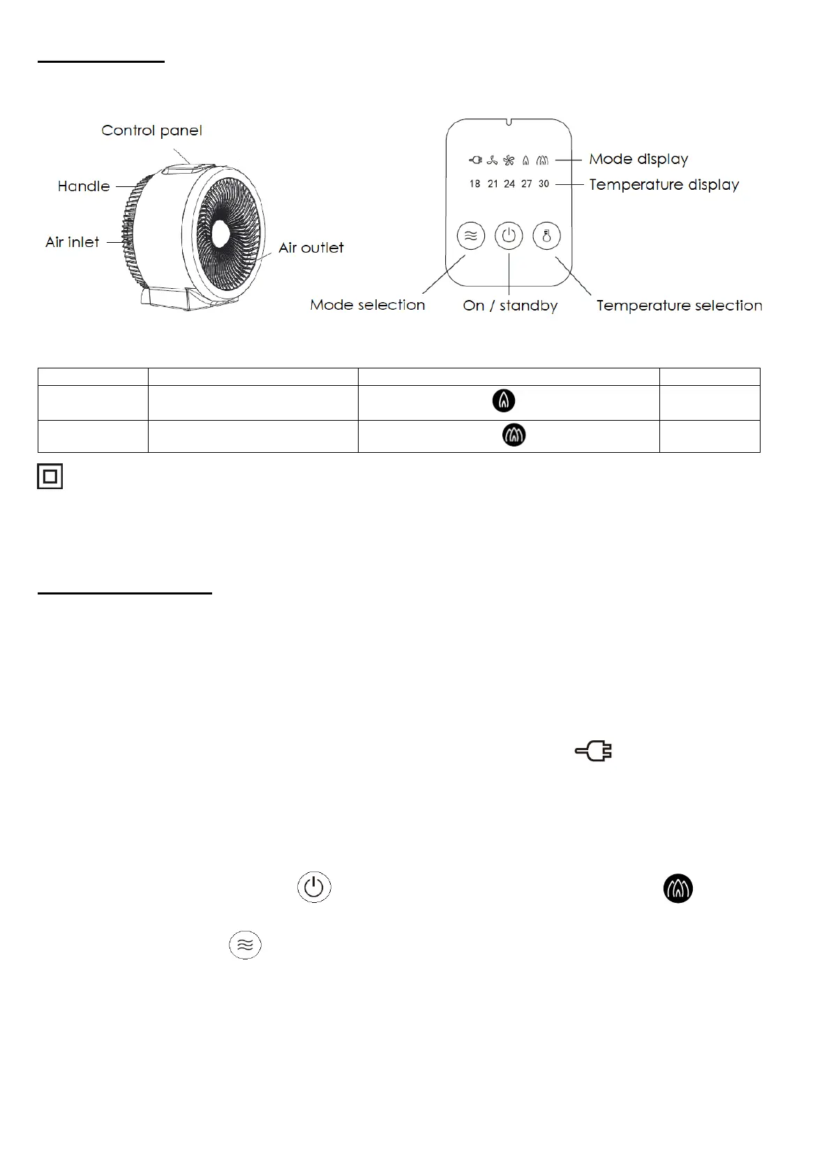 This unit has 2 operating modes, fan heater and fan (cold air)