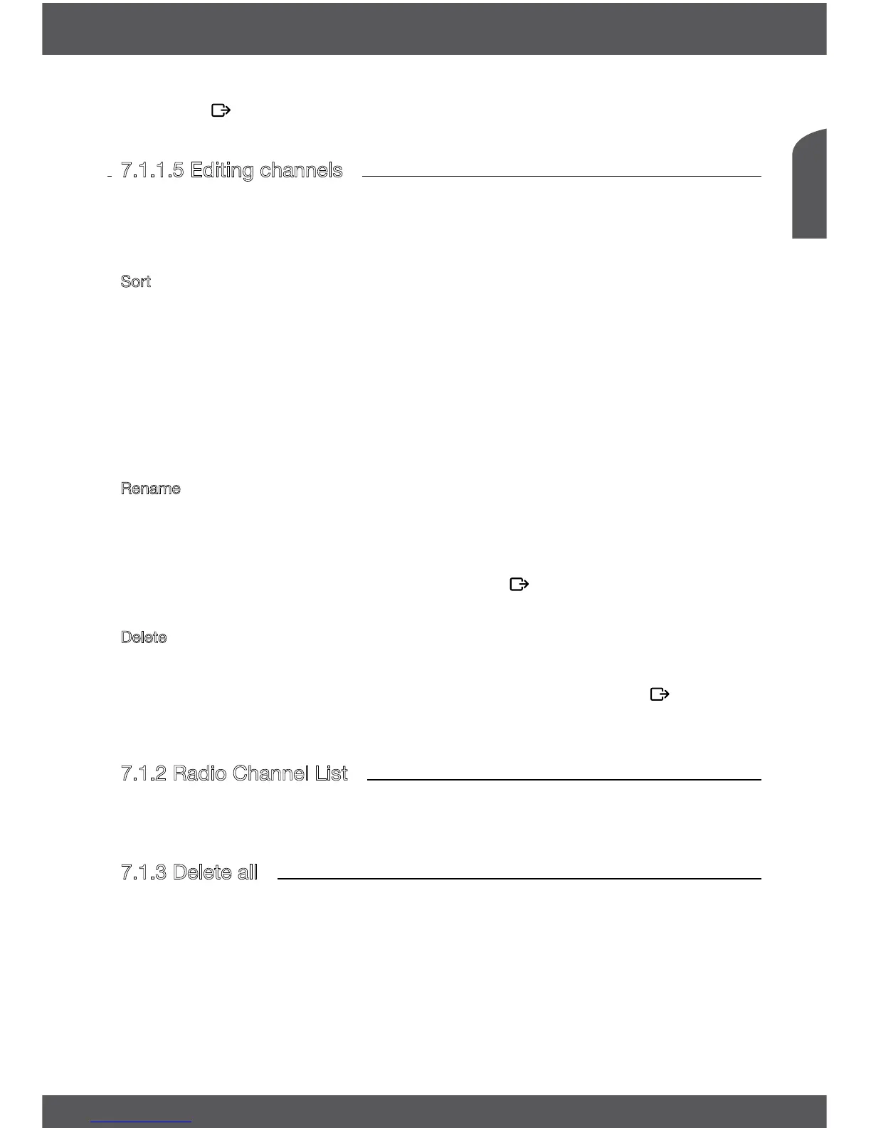 The Edit function allows you to Sort, Rename or Delete channels. To enter the Edit menu,