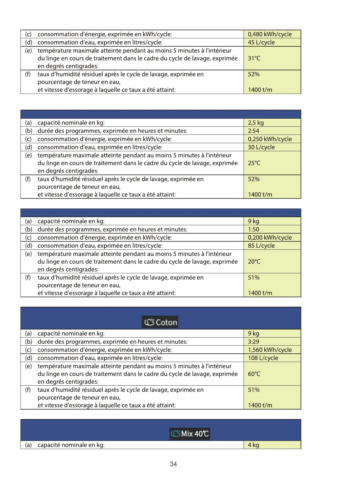 Programme «20 °C» à la capacité nominale de ce programme