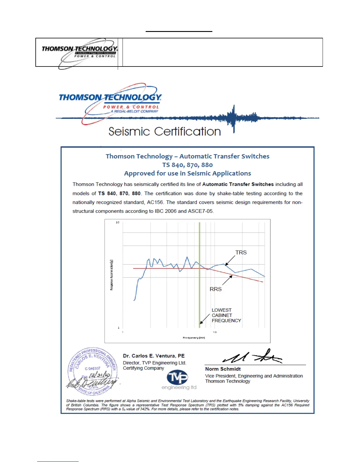 THOMSON TS 840 - APPENDIX “B” SEISMIC CERTIFICATE