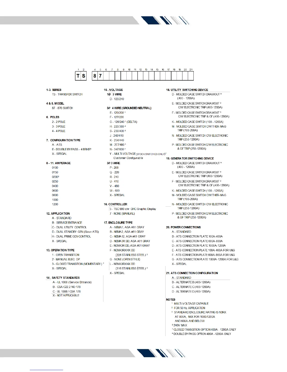 The type of TS 870 series transfer switch supplied is identified by way of a 21digit product code
