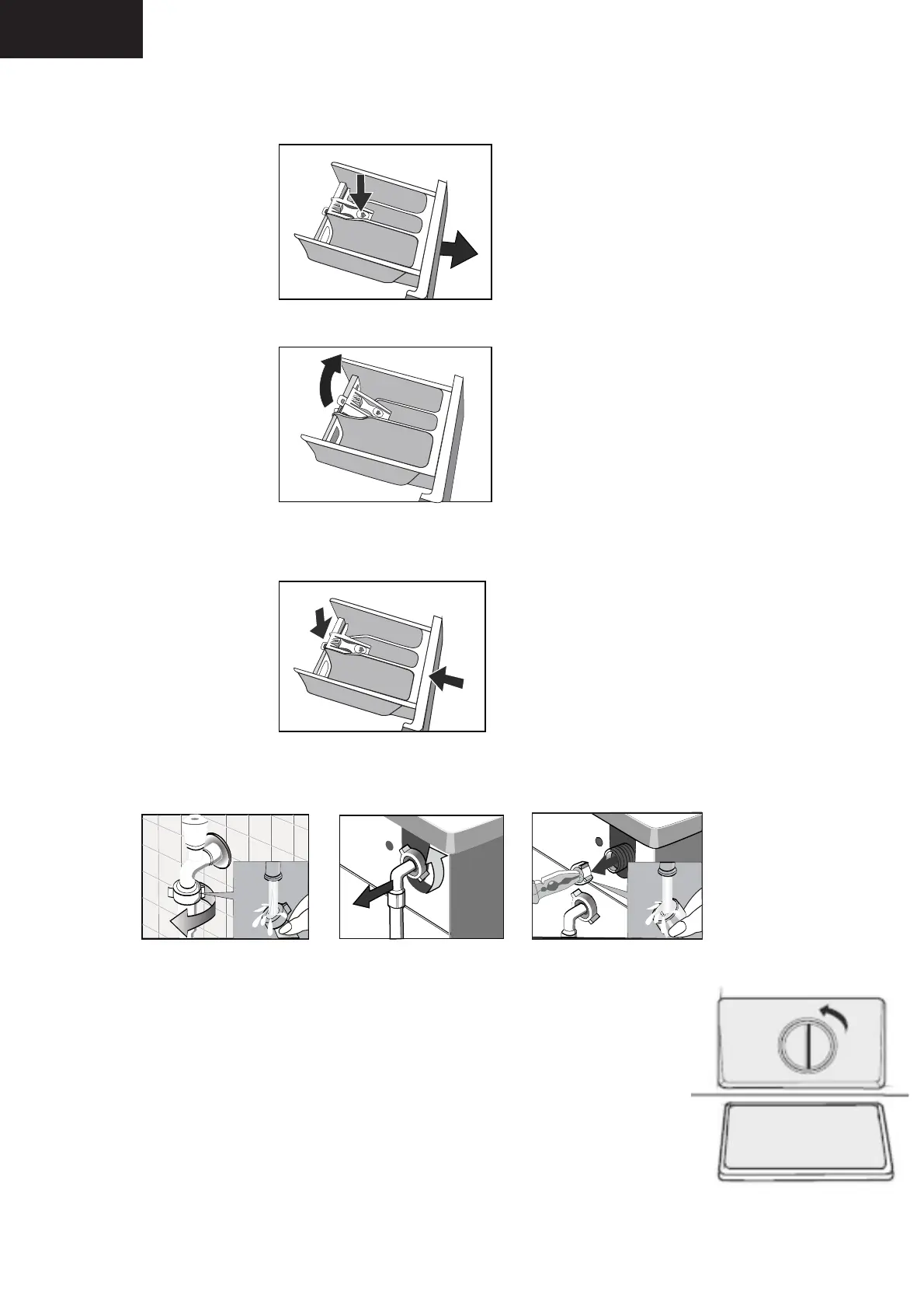 1.Druk op de ontgrendelingshendel binnenin het wasmiddelbakje en trek het uit.