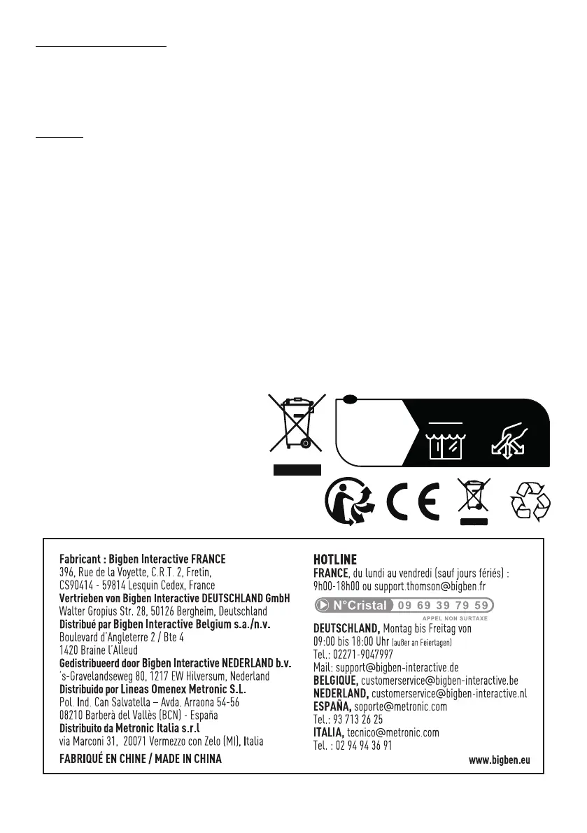 Bigben geeft een garantie van 2 jaar op dit product vanaf de datum van aankoop behalve in de landen