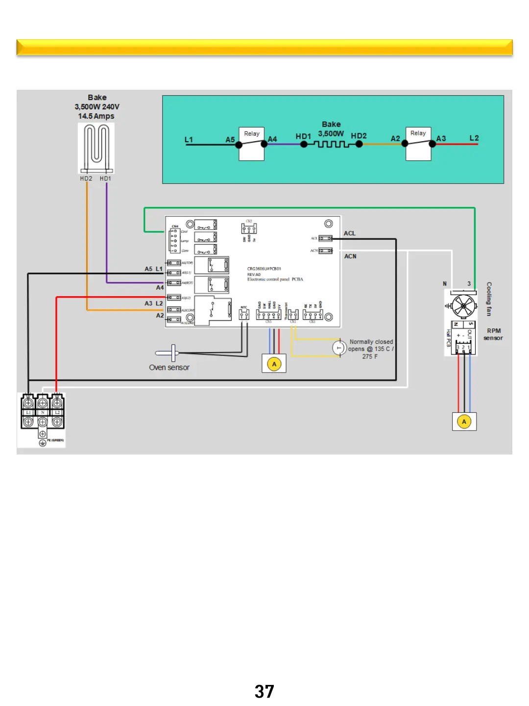 phase voltage will exit relay PCB on A4 Purple Wire and travel to Bake
