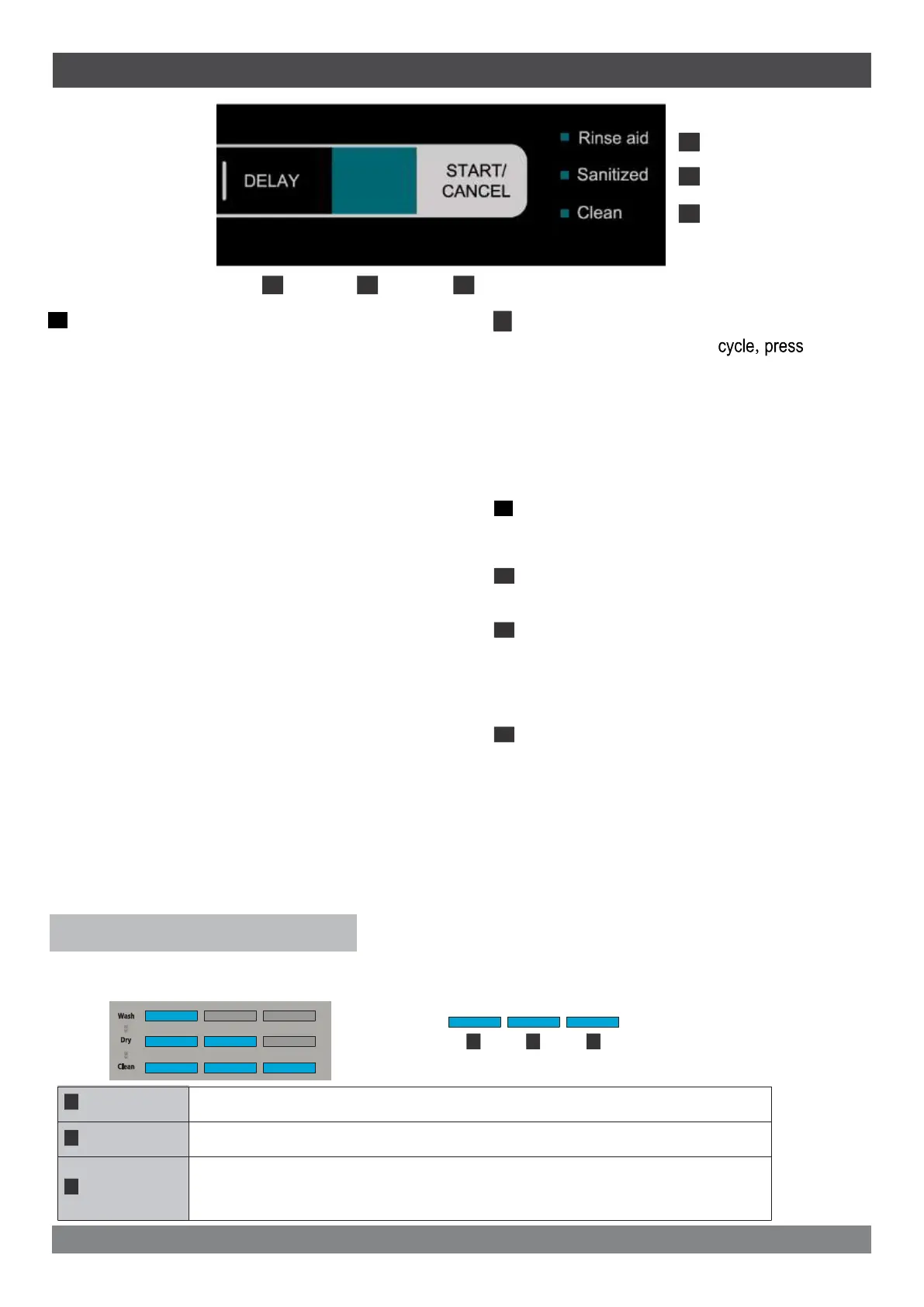 Located on ride side of the front of the dishwasher, these lights indicate how far along is the current wash cycle while