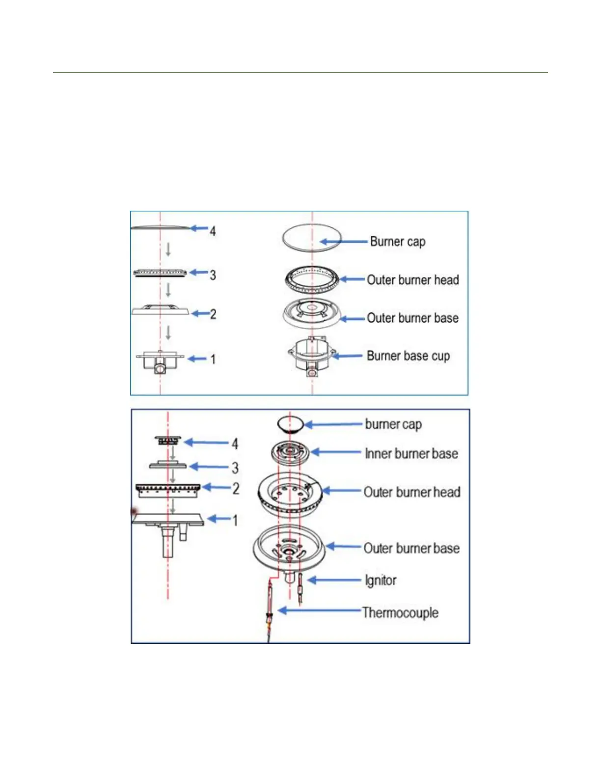 This diagram shows how to replace the burner parts. When replacing the burners, make sure that