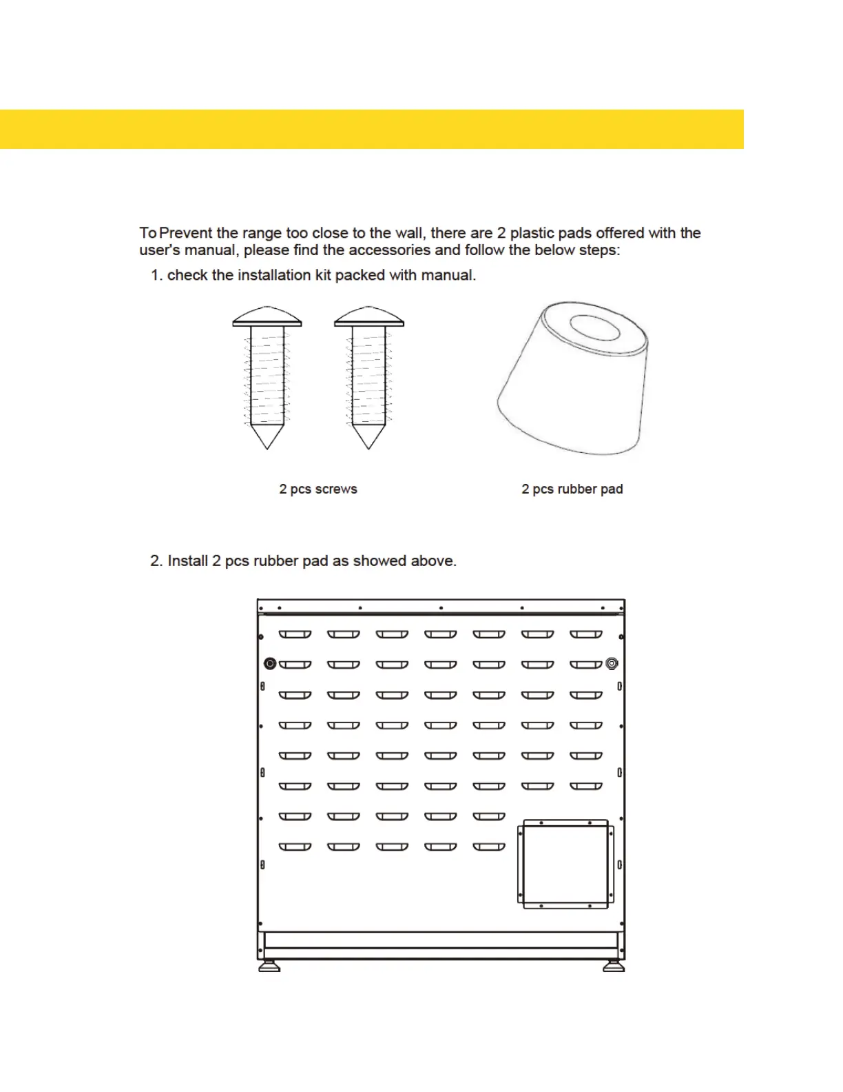 Thor Kitchen HRE Series - RUBBER PAD INSTALL ON BACK PANEL; 1. check the installation kit packed with manual.; 2. Install 2 pcs rubber pad as showed above.