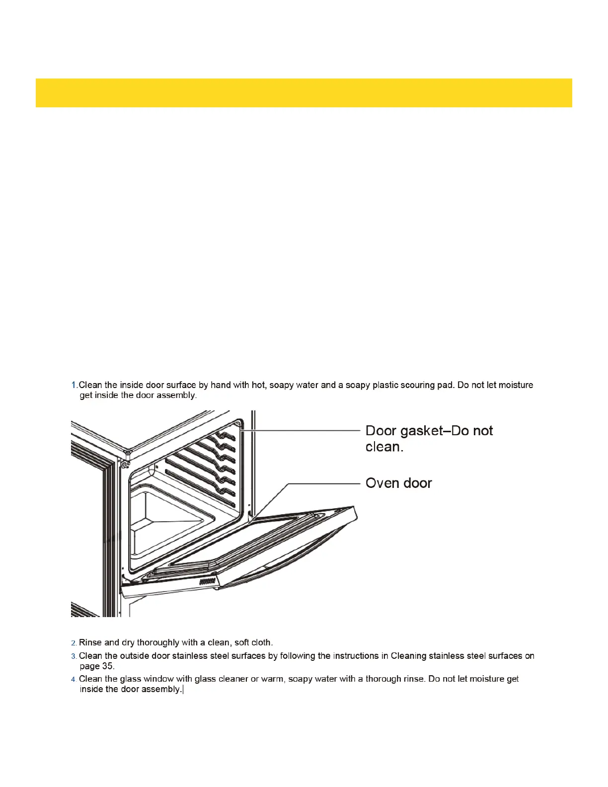 The oven door has multiple surfaces that require different cleaning techniques.