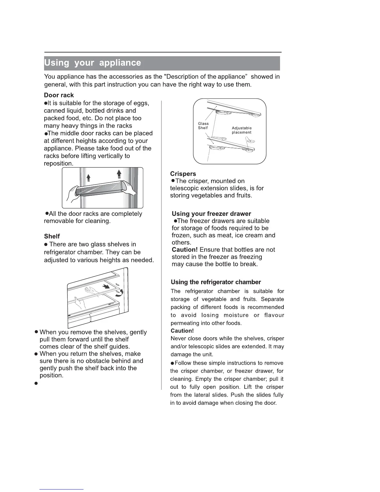 Thor Kitchen HRF3603F - Using Appliance Components; Door Rack Usage Guidelines; Shelf Adjustment and Removal; Crisper Drawer Usage Guide