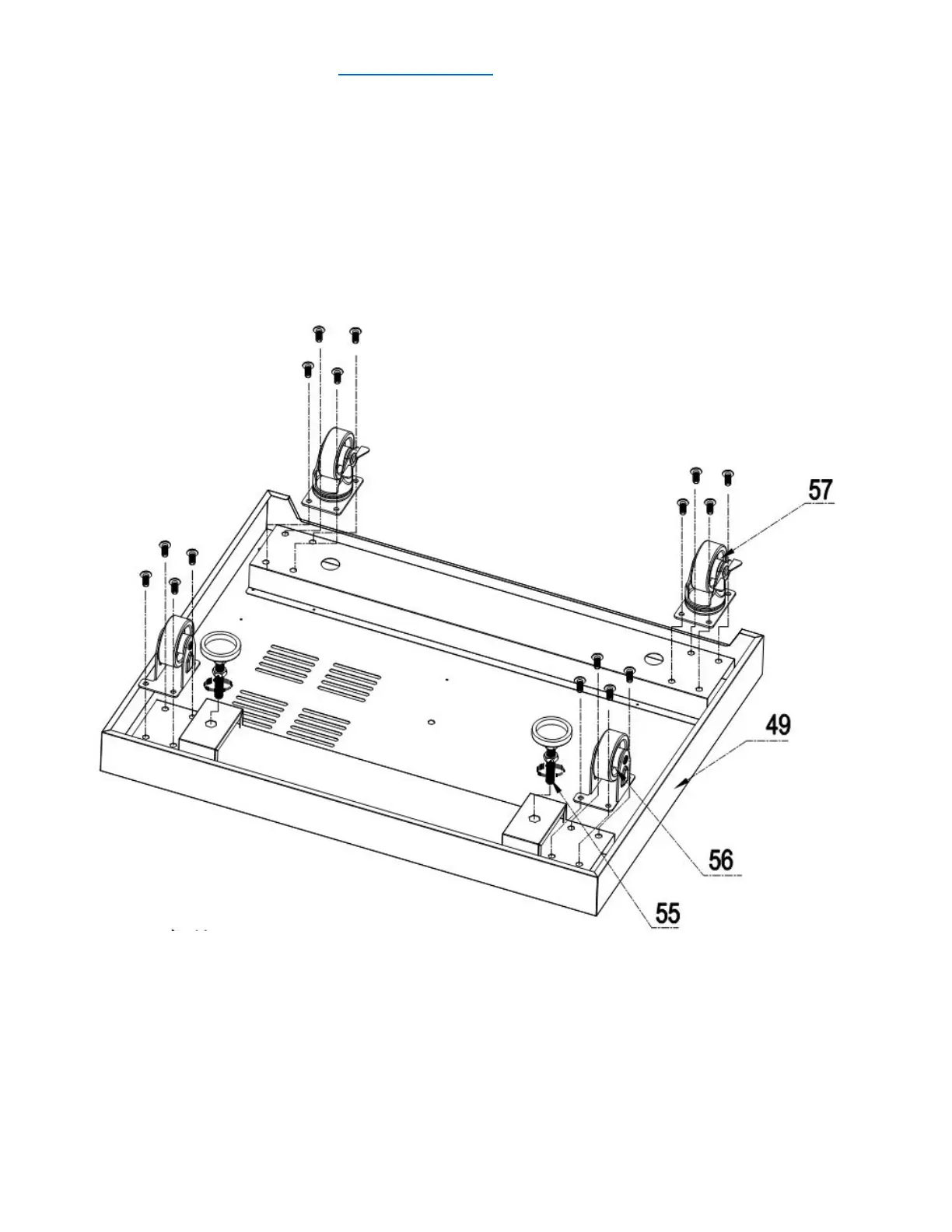 1. Flip the bottom base welding assembly (Part #49) so in order to install legs and casters