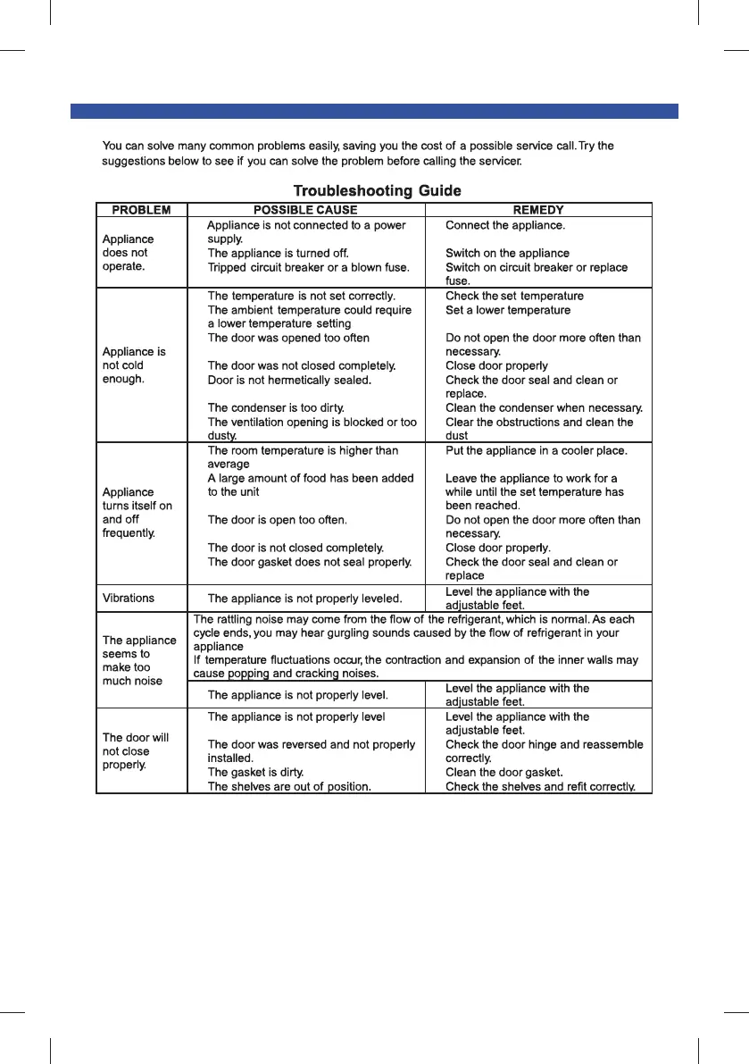 Thor Kitchen TRF2401U - Troubleshooting; Appliance Not Operating; Appliance Not Cold Enough; Frequent On;Off Cycles