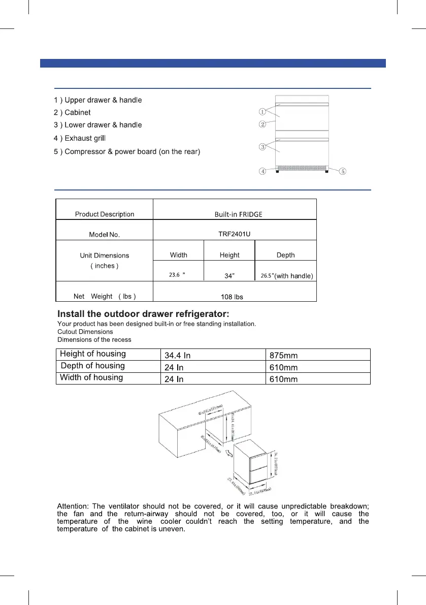 Thor Kitchen TRF2401U - Parts Identification; Product Specifications; Cutout Dimensions