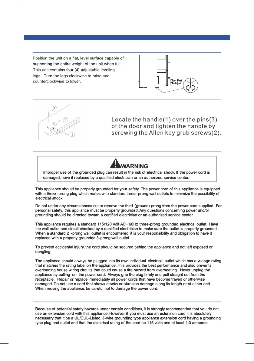 Thor Kitchen TRF2401U - Leveling the Unit; Installing the Handle; Electrical Connection; Extension Cord Usage