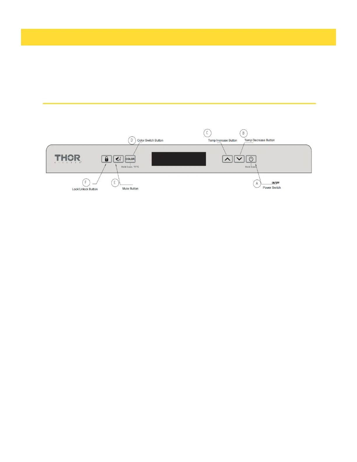 B. Temp Decreases Button: Used to lower (cool) the set temperature by 1°C or 1°F. When the screen is