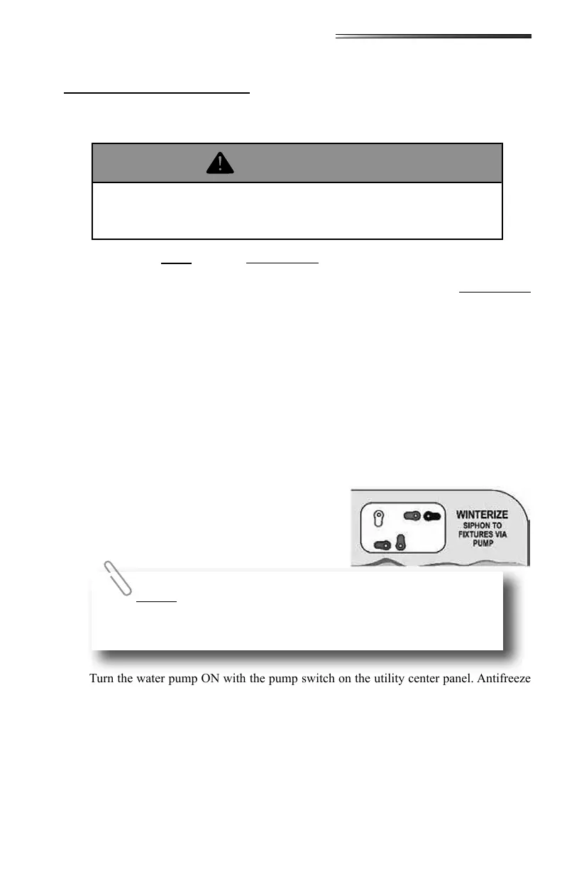 9. Turn the water pump ON with the pump switch on the utility center panel. Antifreeze