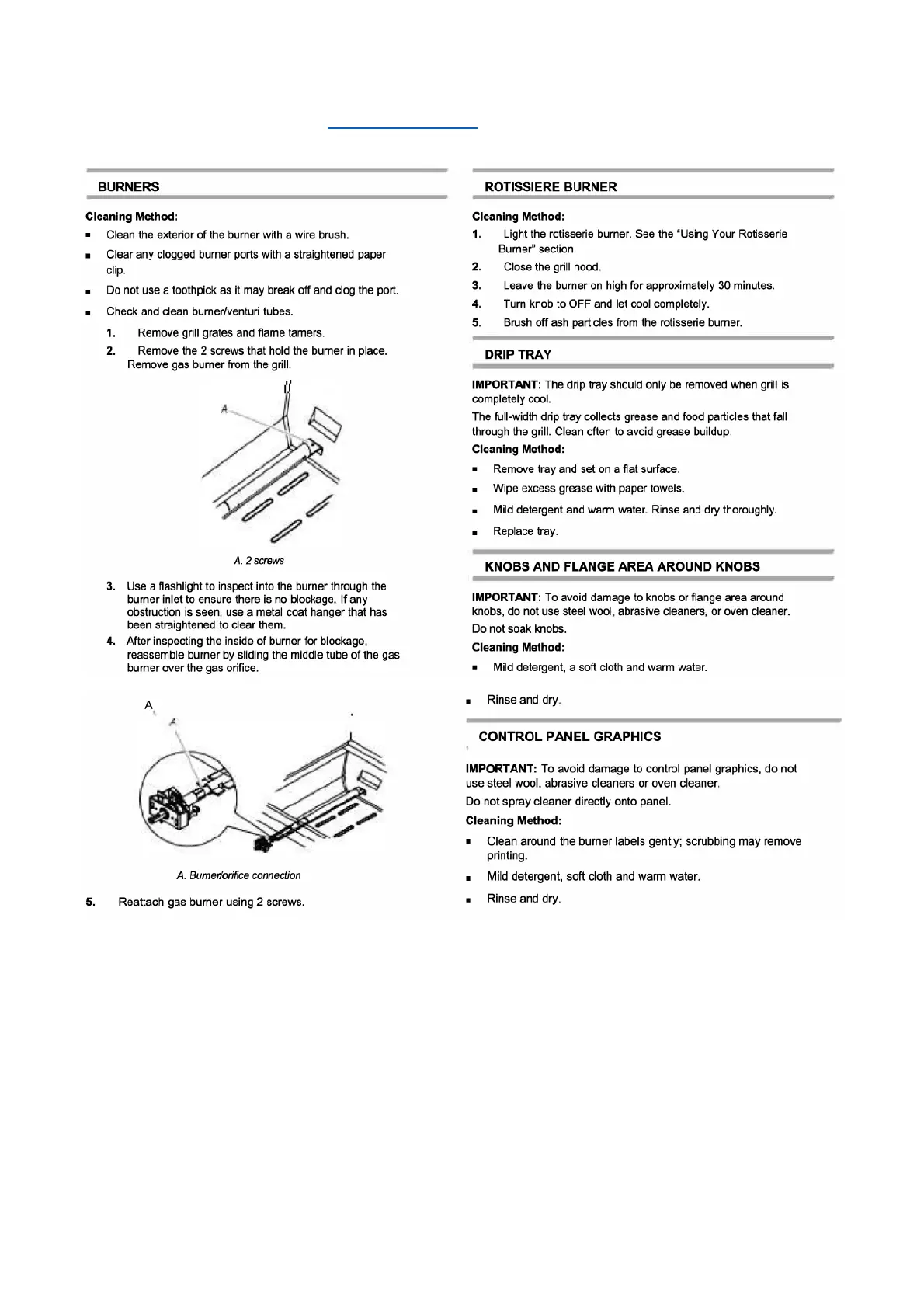 THOR MK04SS304 - Burner and Component Cleaning; Burner and Venturi Tube Cleaning; Rotisserie Burner and Drip Tray Cleaning; Knob, Flange, and Control Panel Cleaning