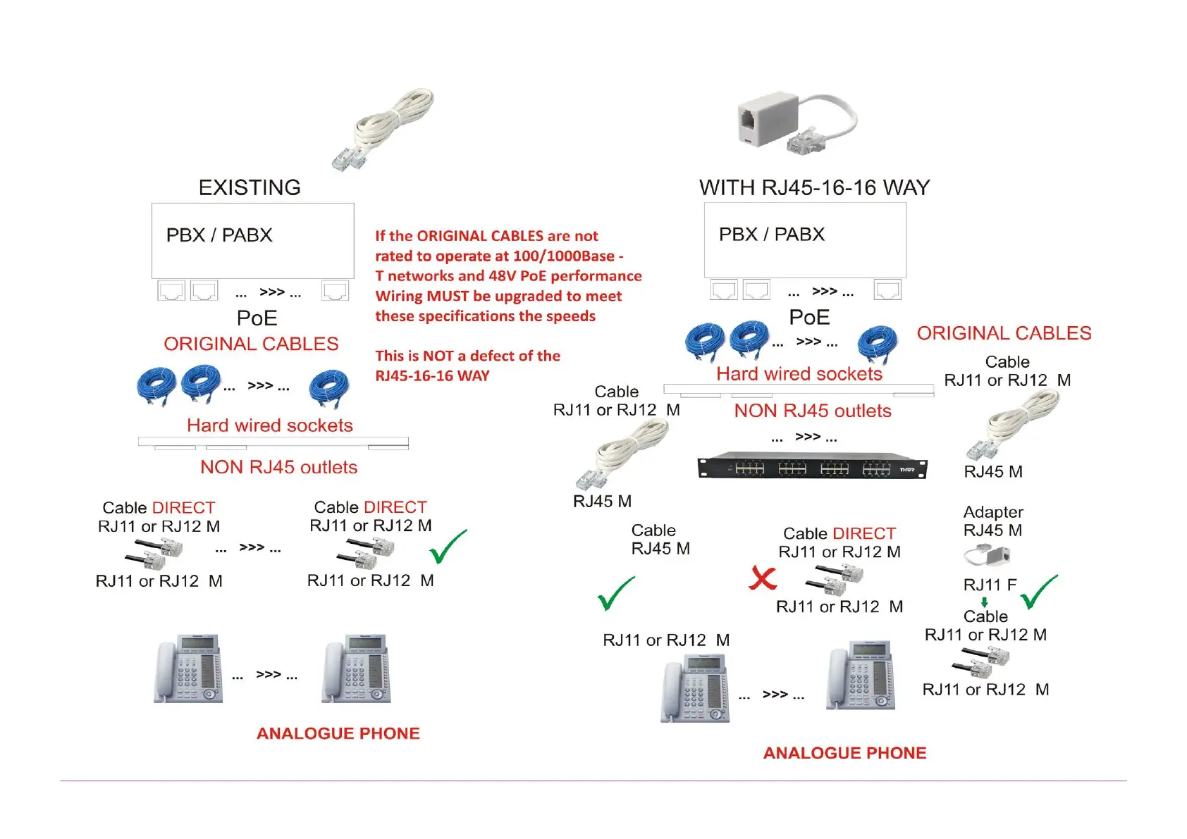 If connecting to Phones with RJ11/12 connectors use of an adaptor as pictured below is recommended