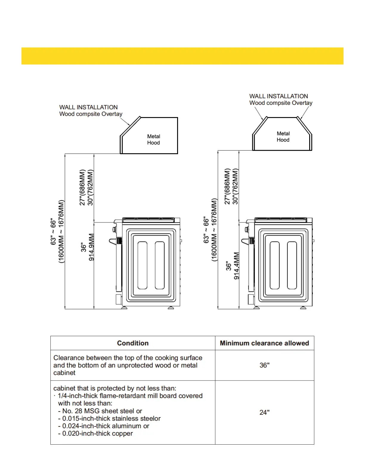 THOR TRG3601 - Hood and Cabinet Clearance Specs; Hood and Cabinet Specifications; Clearance Requirements Table