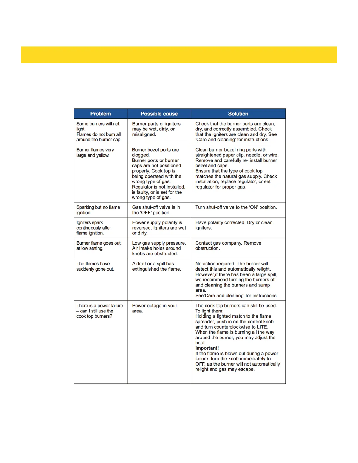 THOR TRG3601 - Cooktop Ignition and Flame Troubleshooting; Cooktop Ignition and Flame Issues; Cooktop Power Failure Operation