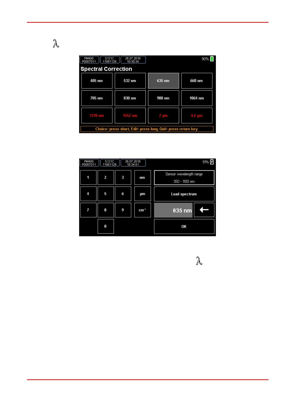 The actual wavelength setting value displays in the field above the button in Needle and Nu-