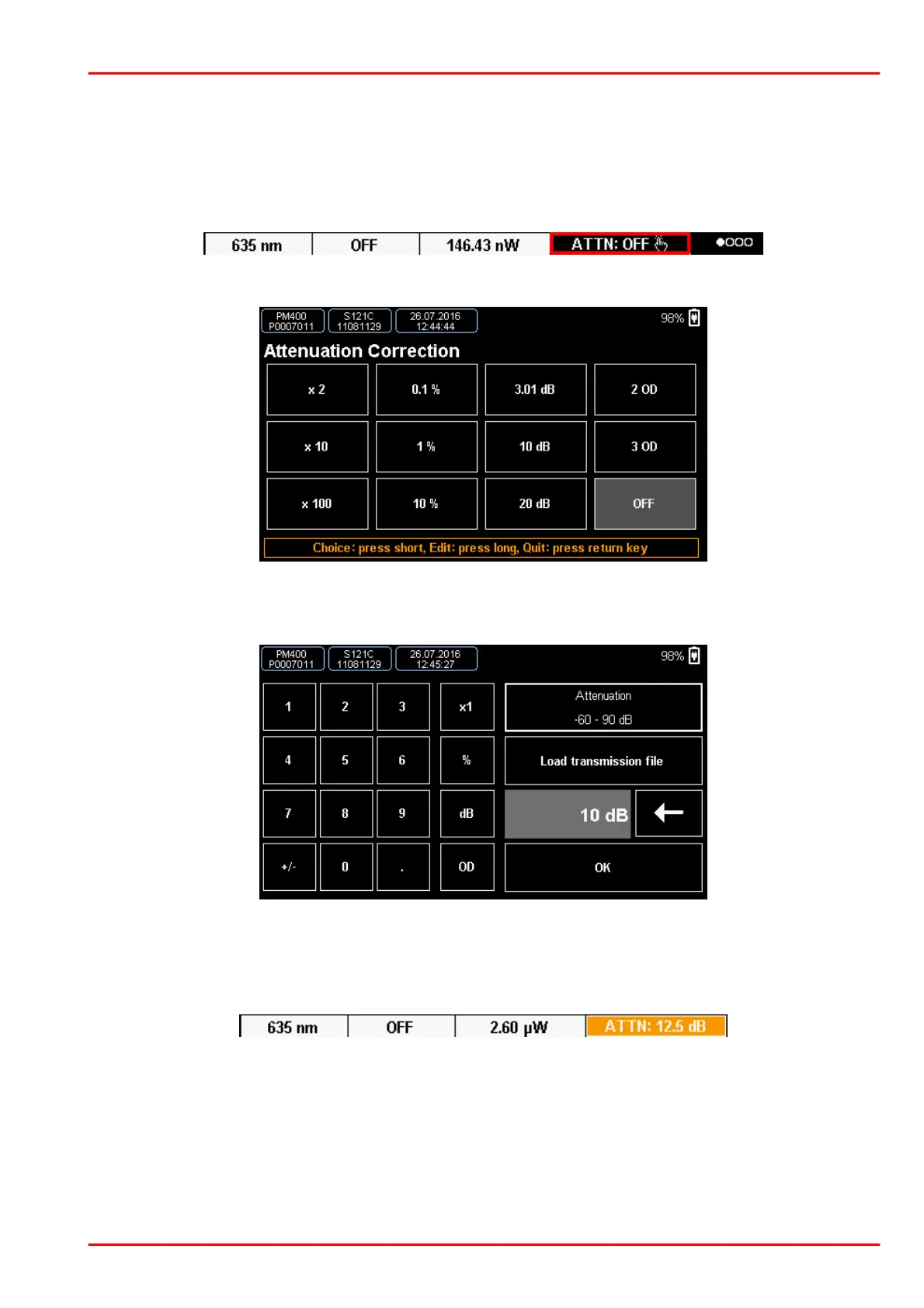 To enter the menu for the filter correction, press the ATTN button in the Numerical or Needle
