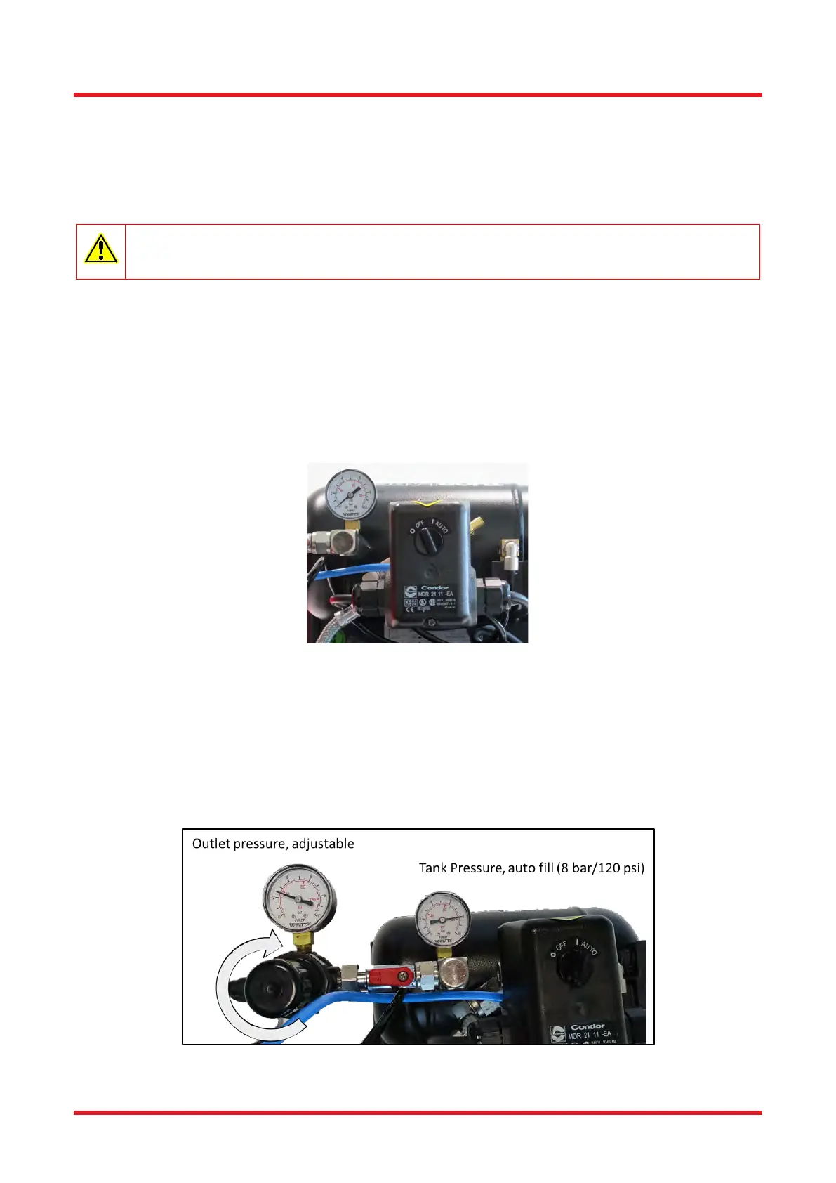 maximum value allowed (8 bar/120 psi standard) and starts refilling again when the pressure drops to the minimum value