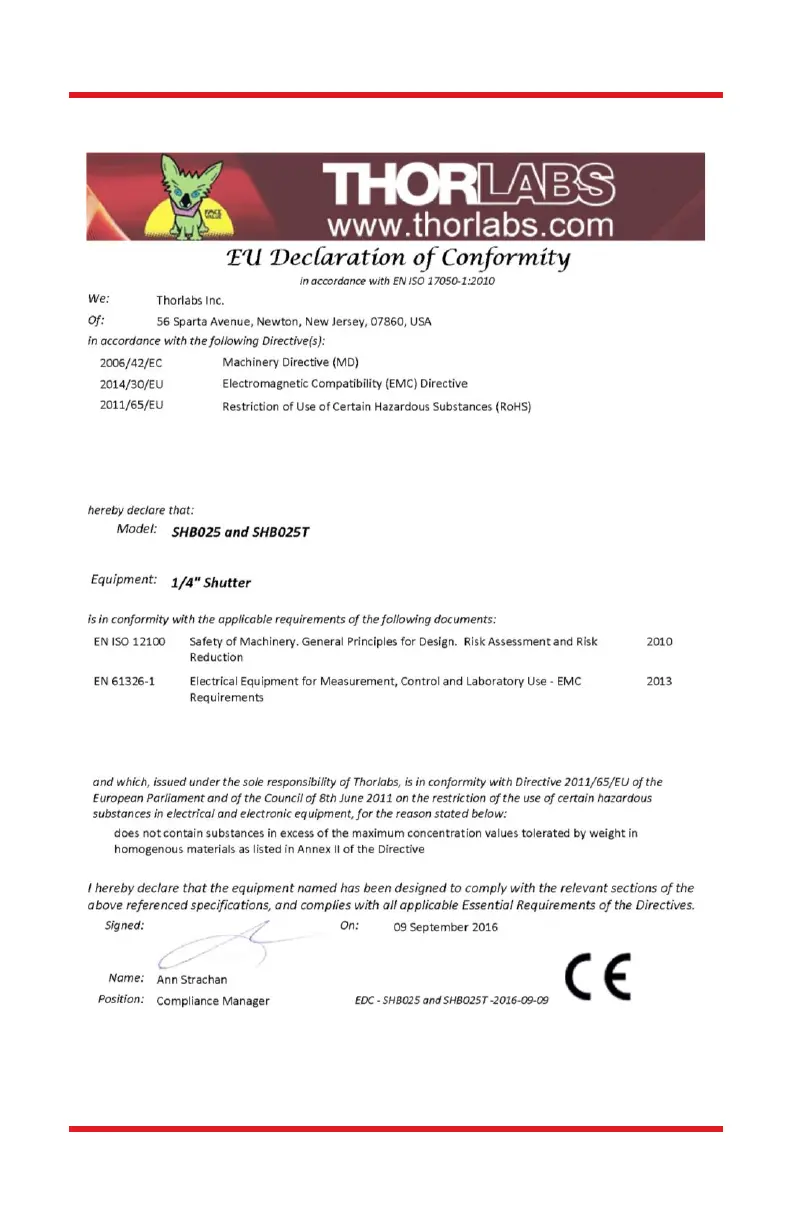 THORLABS SHB025 - Chapter 10 Certificate of Conformance