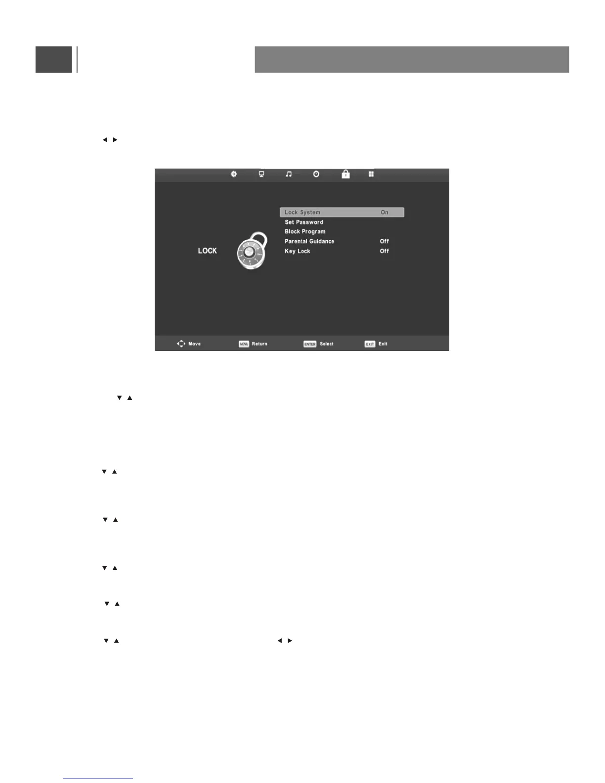 Press button to select Parental Guidance, then press Enter button to enter sub-menu to select.