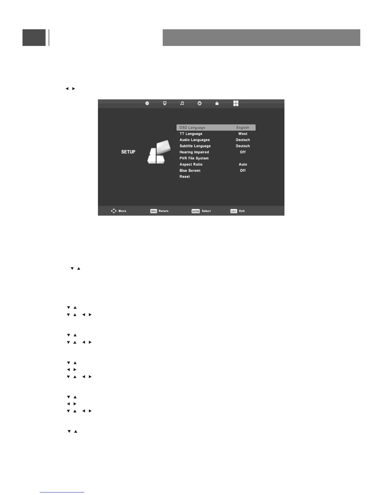 Press button on the remote control to select SETUP in the main menu.