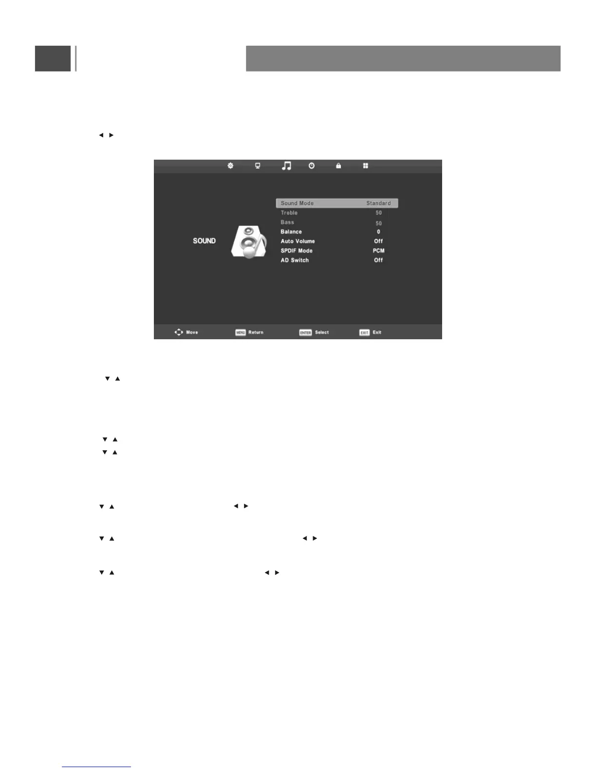 Press button on the remote control to select SOUND in the main menu.
