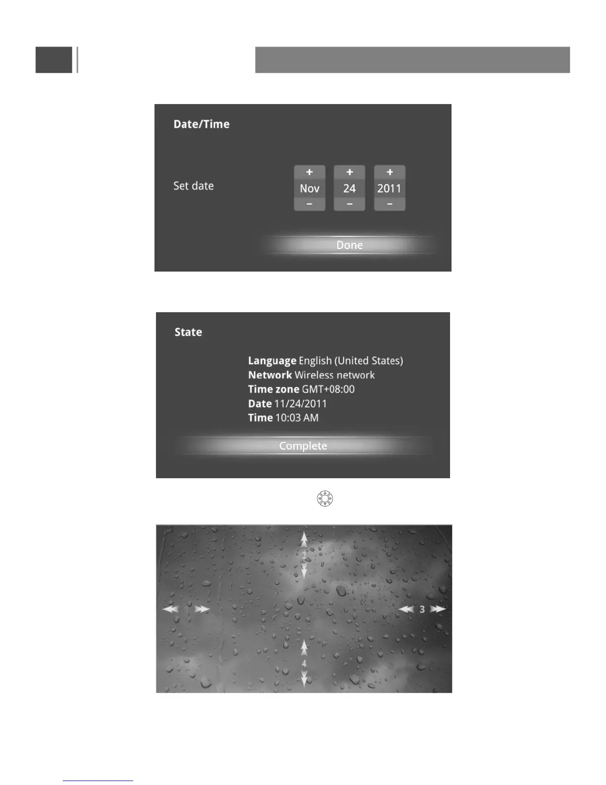 User can setup the Language, Network, Time Zone, Data/Time, and adjust screen size.