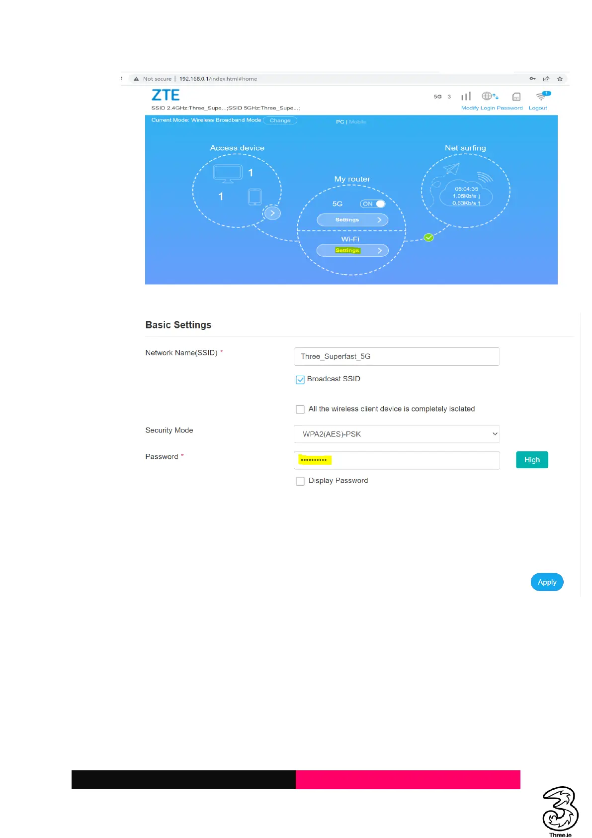b. Click on the WiFi Settings and change the WiFi Password and Apply