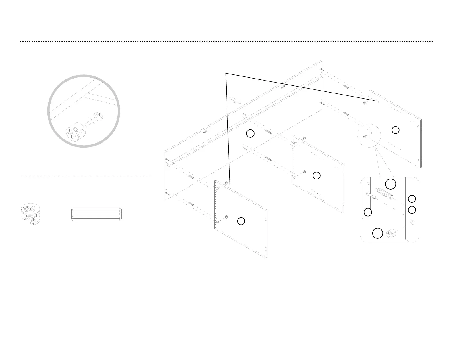 6.2. Orient and attach the side panels (D) and partition panel (E) to the top panel (A) using six cam locks (H1).