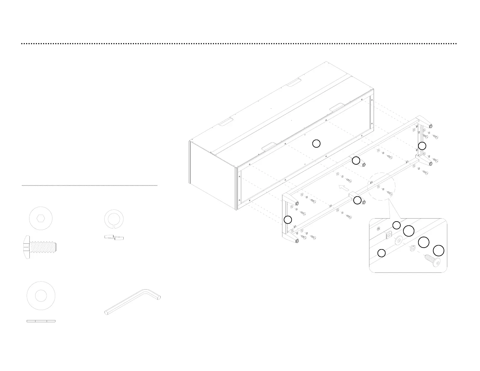9.1. Insert twelve 15 mm bolts (H4) with the lock washers (H5) and flat washers (H6) through the metal tabs on the assembled base and securely screw into the
