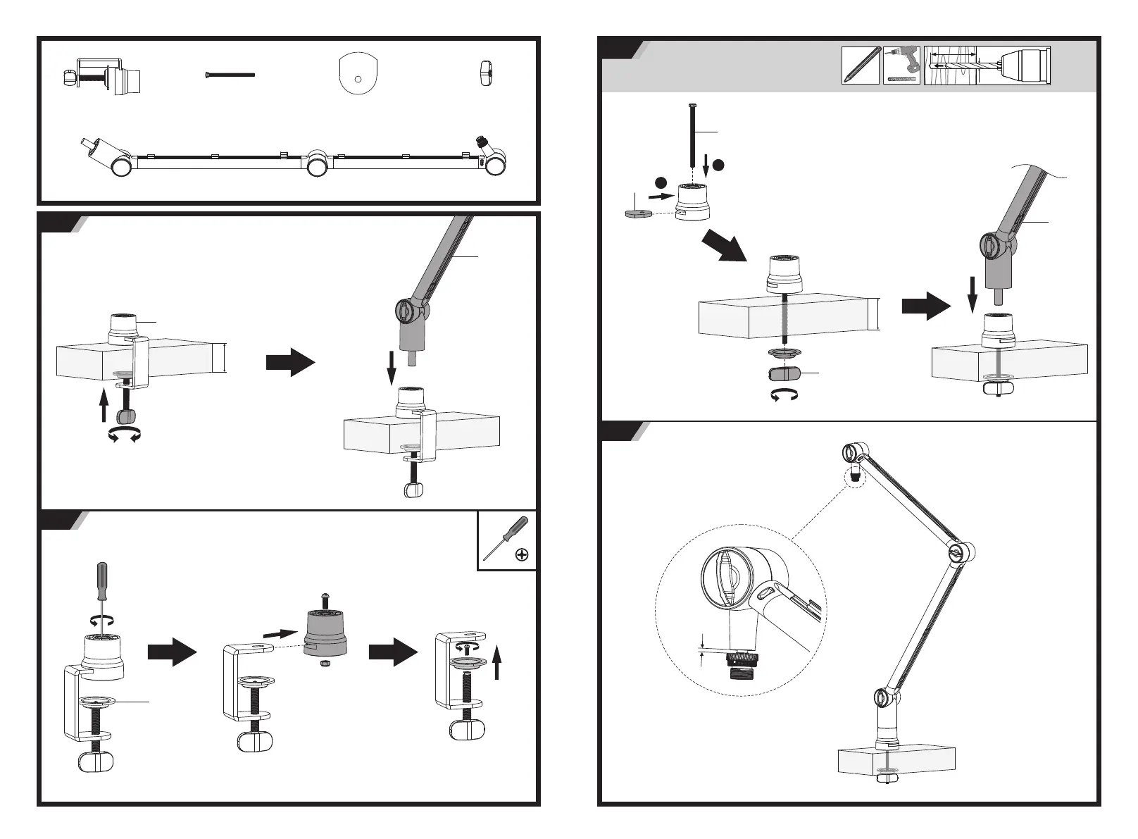 THRONMAX ZOOM S3 - Assembly Steps; Clamping Base Assembly; Boom Arm Connection; Final Arm Configuration