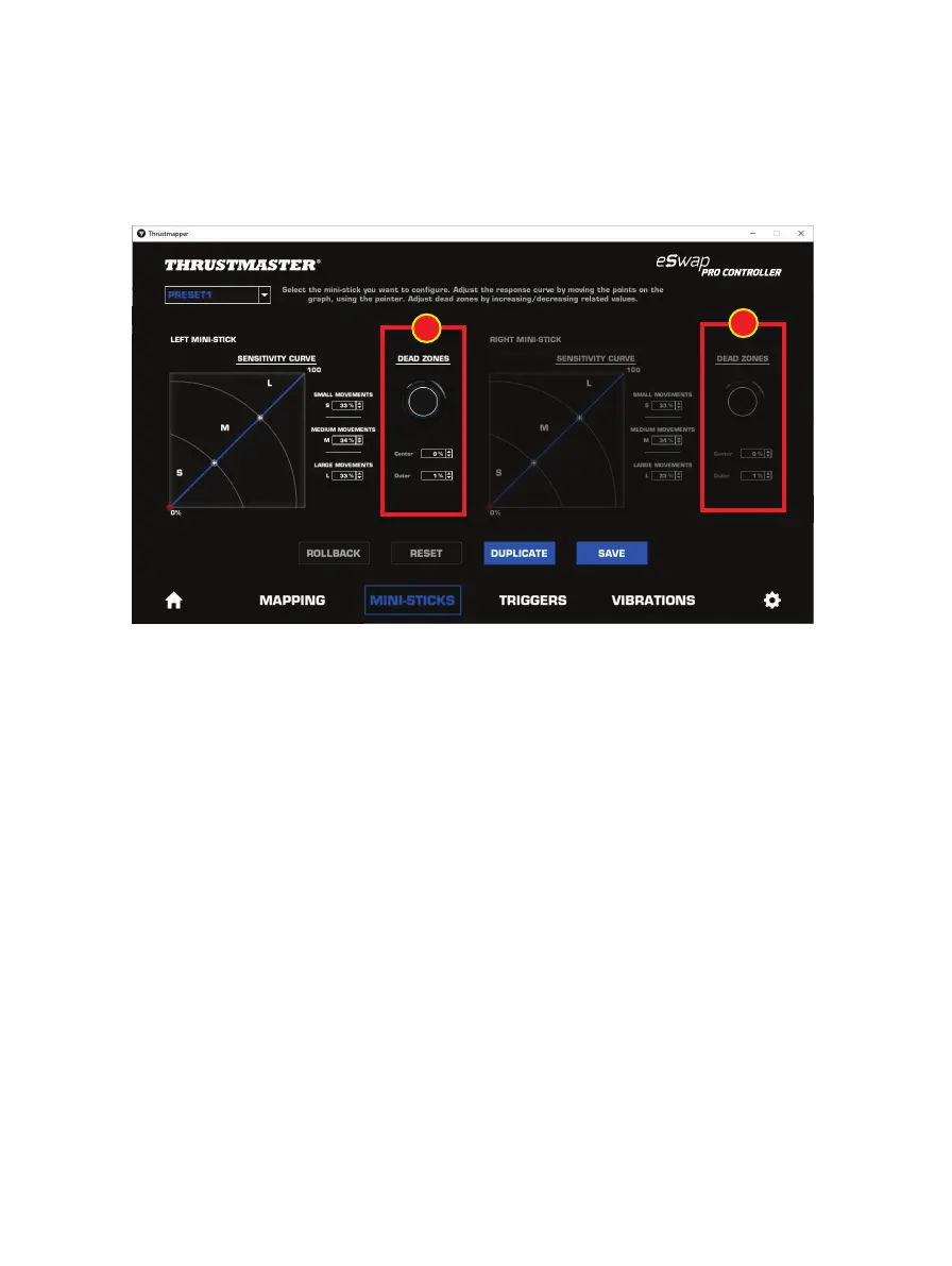You can also customize the center and outer dead zones for the mini-sticks (1).
