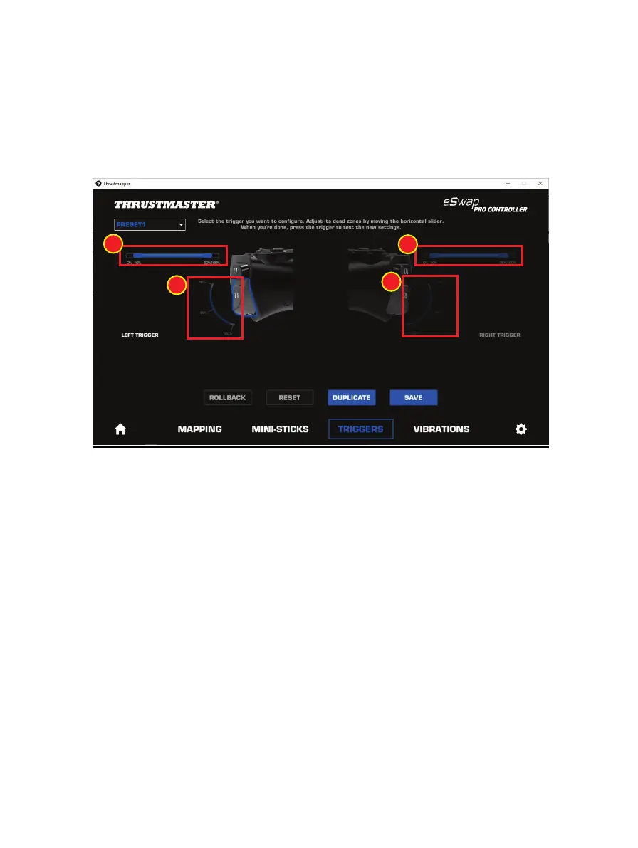 - Move the sliders representing the beginning and end of the dead zone on the selected trigger (1).