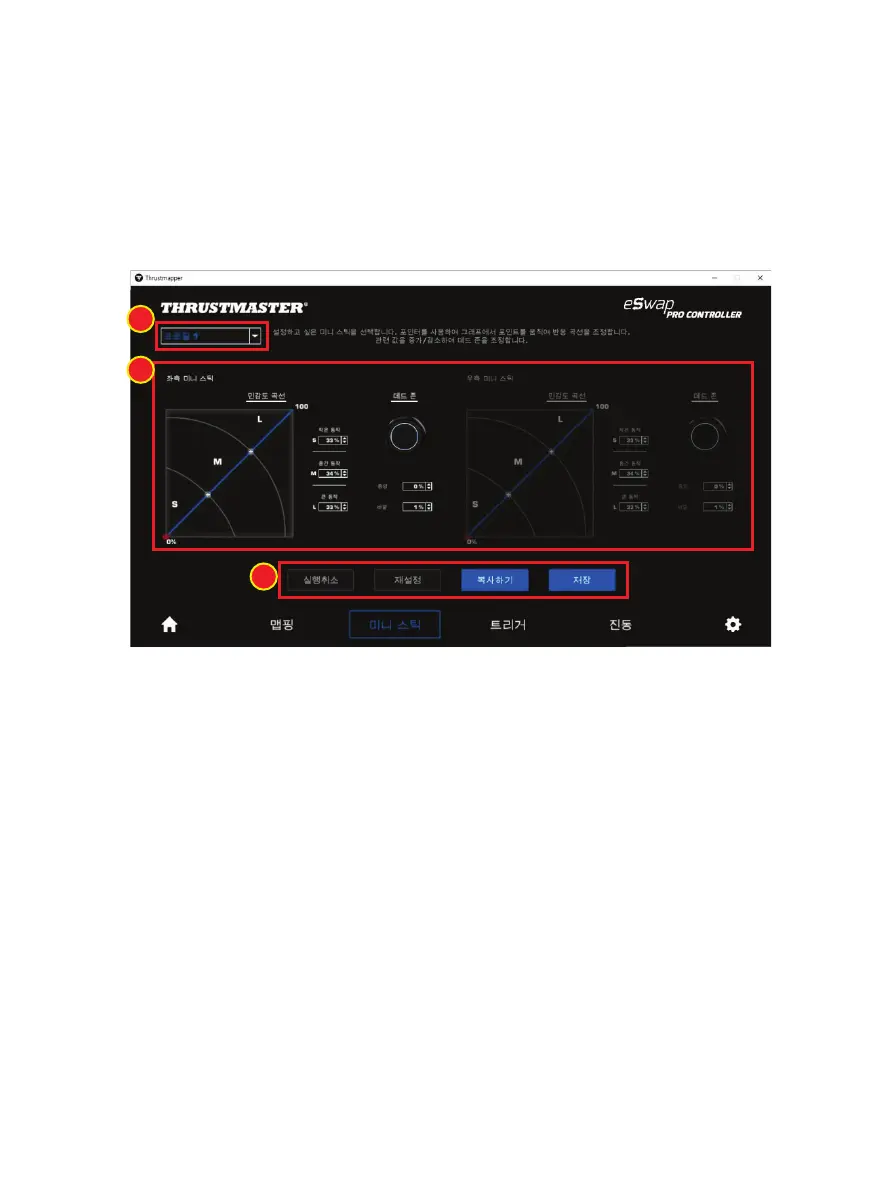 최적의 동작 제어를 위해 좌측과 우측 미니 스틱의 감도 곡선 및 데드 존을