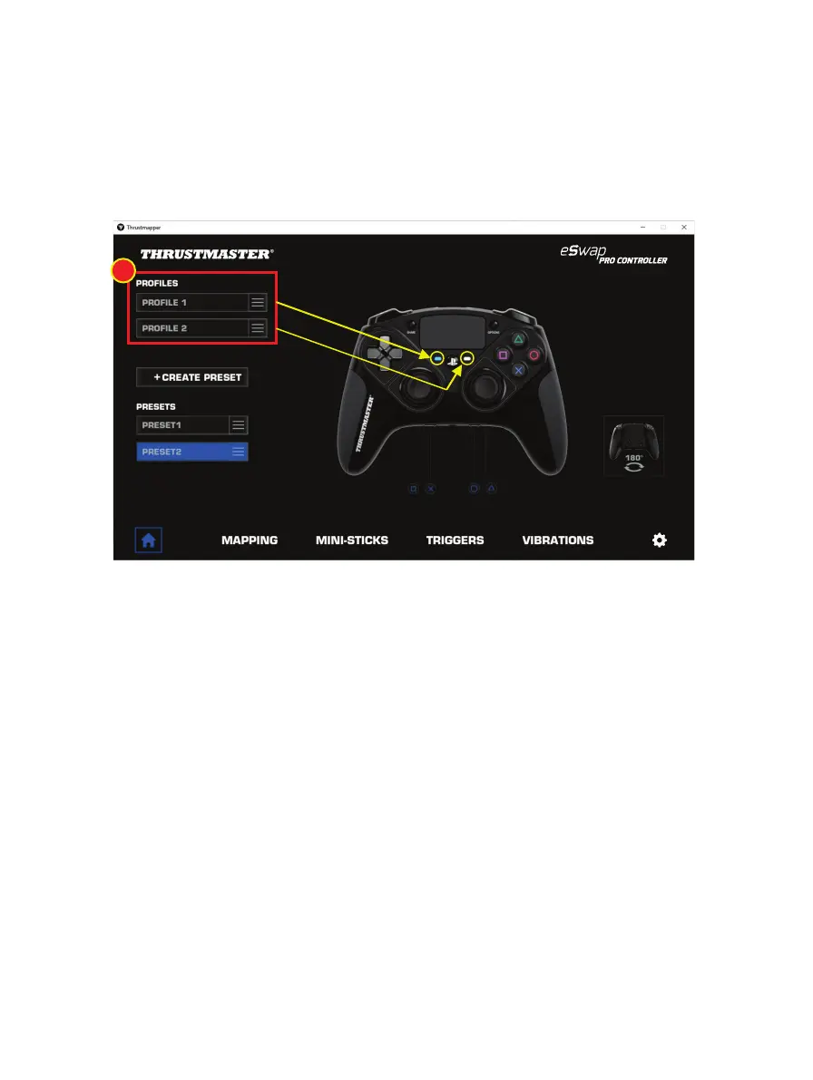 The gamepad includes two profiles loaded by default (1). Each profile corresponds to a storage