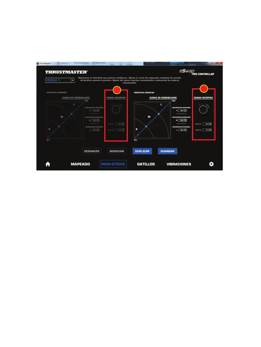 También puedes personalizar el centro y las zonas muertas exteriores de los mini-sticks (1).