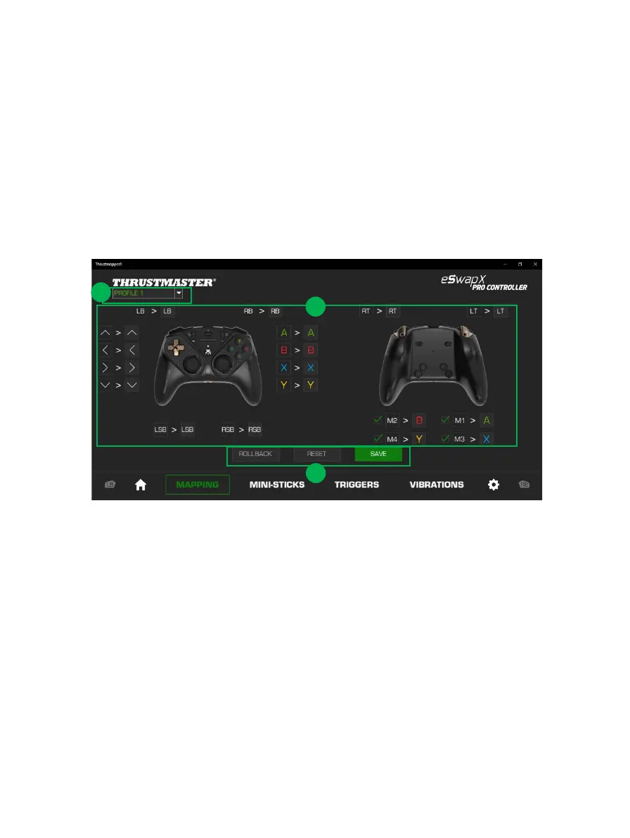 - You can modify the mapping of the gamepad’s buttons by swapping their functions (2).
