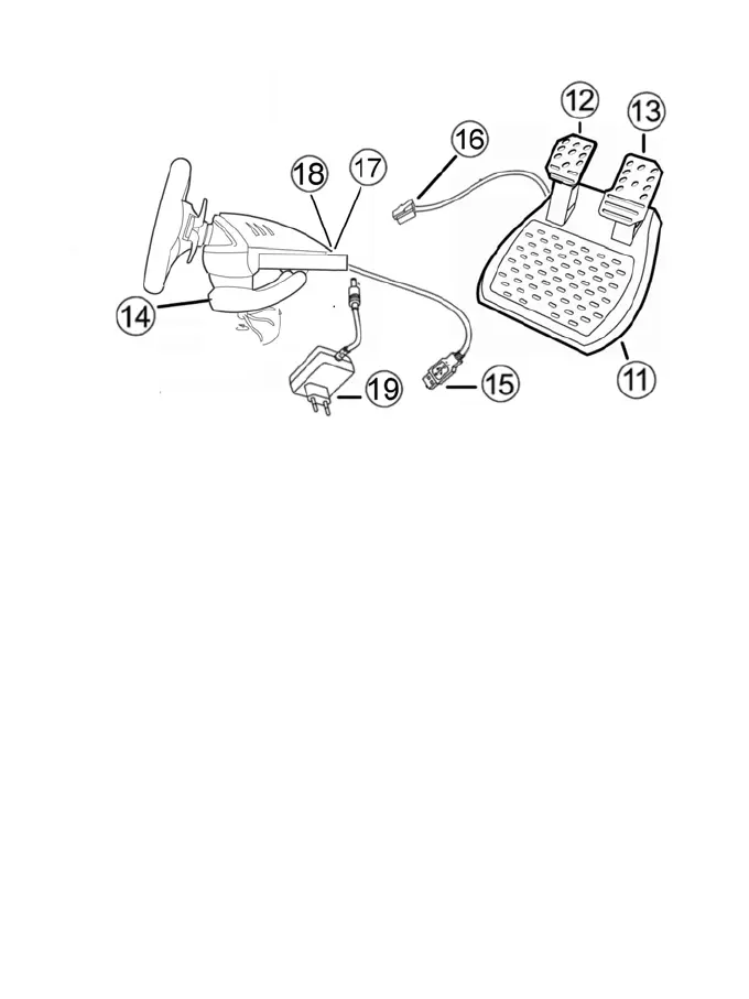 1. Ligue o conector dos pedais (16) ao conector RJ45 principal (17) situado atrás do volante.