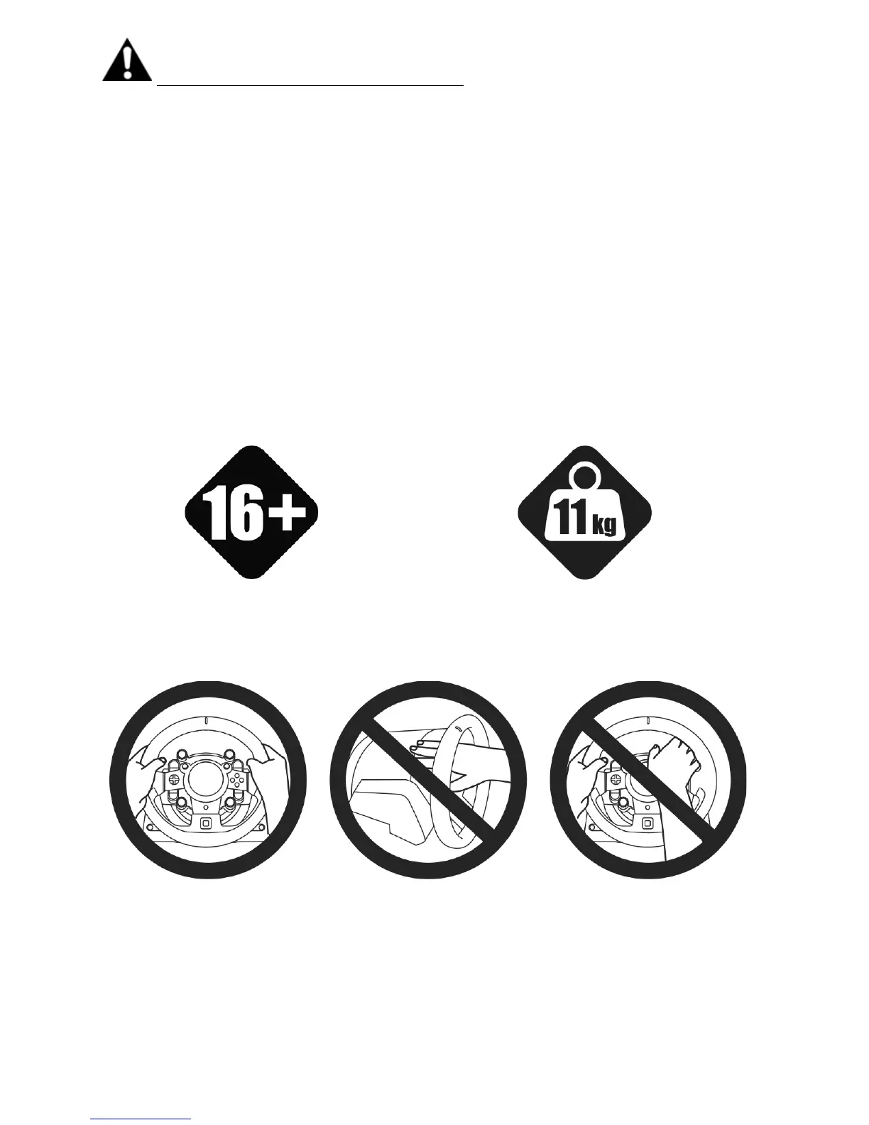 * 在校准和游戏过程中,切勿将手或手臂穿过赛车方向盘的开口。