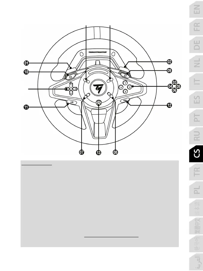 - 4 LED diody otáček motoru (7) fungují ve hrách kompatibilních s Thrustmaster SDK. Seznam