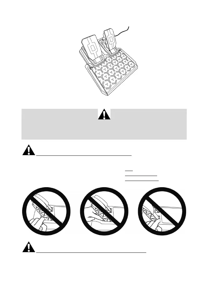 * Během herní relace nikdy nedávejte prsty na nebo do blízkosti přední části základny pedálů.