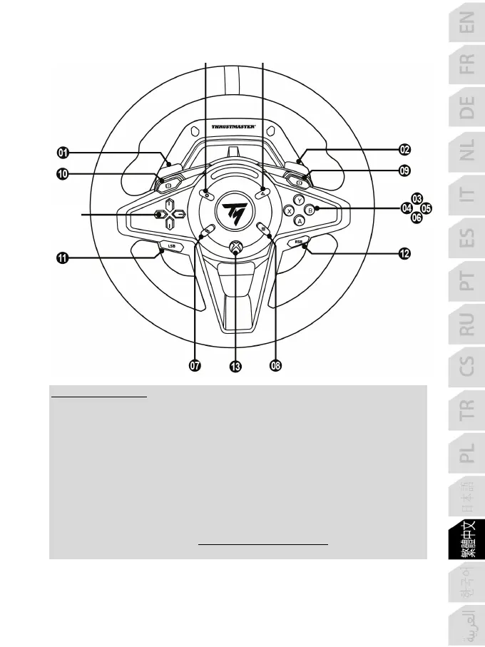 工作。相容遊戲的列表詳見:https://support.thrustmaster.com(位於 Racing Wheels